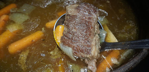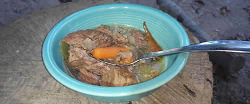 #4. Then we finished the soup outside over the fire to keep it a bit authentic. The beef was incredibly tender, and the vegetables were a little overcooked, as you can imagine. Some of the vegetables began to break down into the broth and the soup got murky from this.