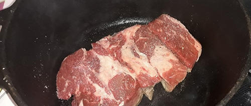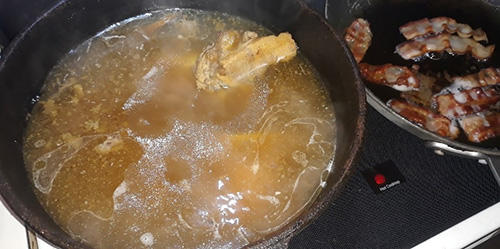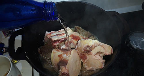 #1. I used about 2 lbs of boneless beef ribs mostly because they were on sale and cheap. No matter what cut of beef you put into the pot it’s going to be tender after 2 days of cooking. Sear your meat in the Dutch oven until you get some good brown color on the sides. Then add your soup bones to the pot before covering it all with cold water. Cold water is key to drawing the flavor from bones. When making traditional stock you want to start with cold water and bring it up to a simmer very slowly.