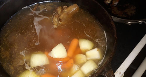 #3. We added our vegetables to the mix the next day and allowed them to simmer for another 12 hours. This was one of the most hands-off parts of making the soup. I did not ladle the scum or anything to see how it would look after 12 hours of cooking. It was our way of simulating how the soup would cook while people might be away from camp.