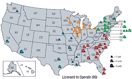 We currently have 60 commercially operated nuclear power plants, containing a total of 98 nuclear reactors. Surprisingly, the state of Illinois has the most, with a total of 11 operating reactors. A total of 12 states generate more than 30% of their power through the use of nuclear power.